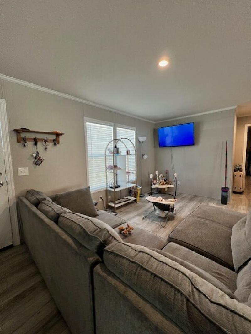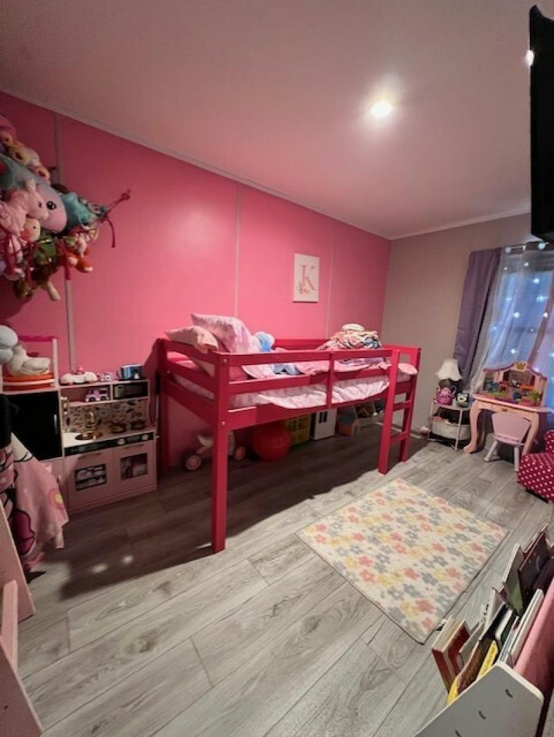 The home features an open-concept layout, with the kitchen flowing seamlessly into the dining and living areas. Laminate floor throughout with a walk-in closet in the master bedroom. Additionally, there's an outdoor shed providing extra storage space.