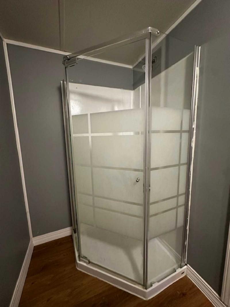 The home features an open-concept layout, with the kitchen flowing seamlessly into the dining and living areas. Additionally, there's an outdoor shed providing extra storage space.